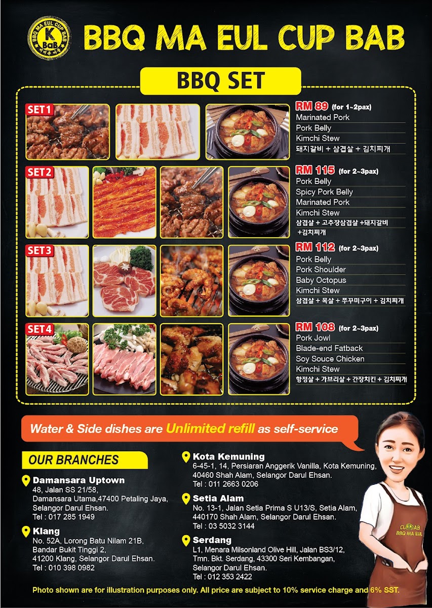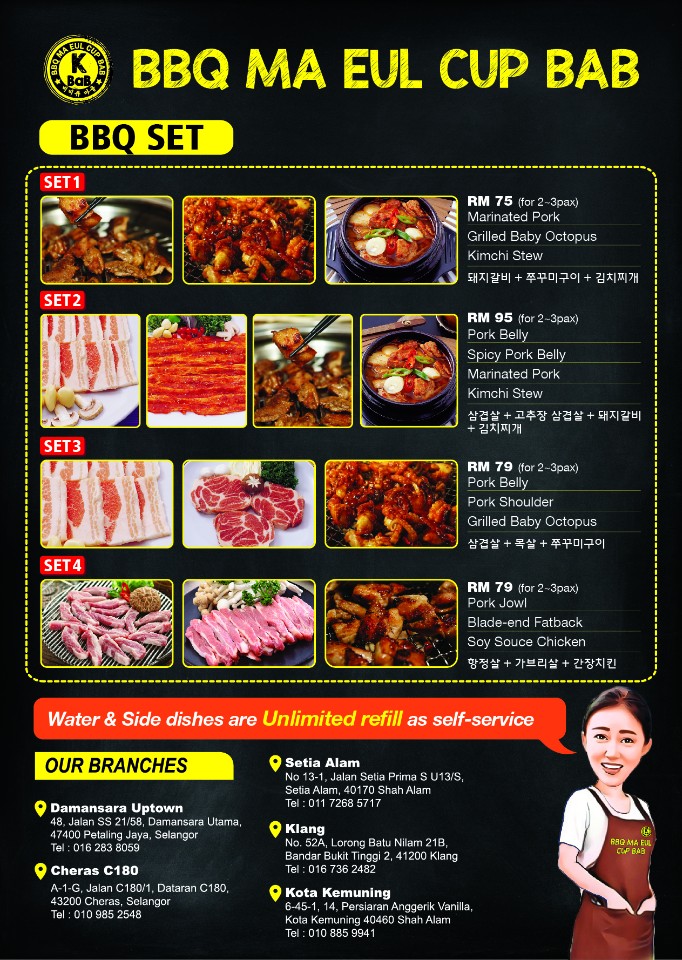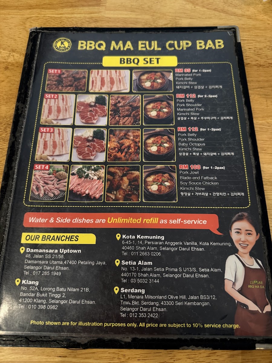 Nestled in the heart of Kota Kemuning, BBQ Ma Eul Cup Bab offers an authentic Korean dining experience that captivates both newcomers and seasoned fans of Korean cuisine. This spacious, clean restaurant specializes in premium cuts of pork and chicken, perfect for grilling at your table or prepared by attentive staff. The marinated pork stands out—tender, juicy, and bursting with flavor.